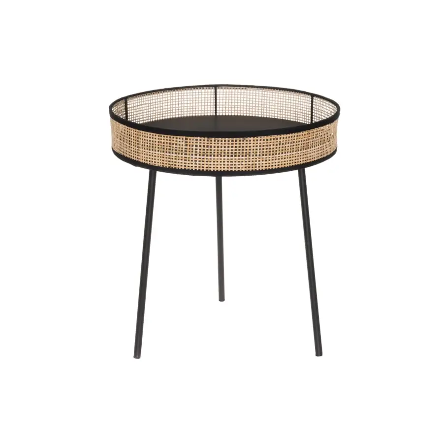 The elegant table beautifully combines natural-colored rattan and black-painted metal. Practical small table is suitable for many spaces and uses. Maximum load 10 kg. KD.