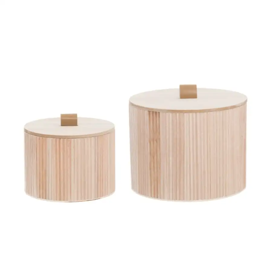 A stylish wooden box with a lid hides small household items inside. Striped pages.