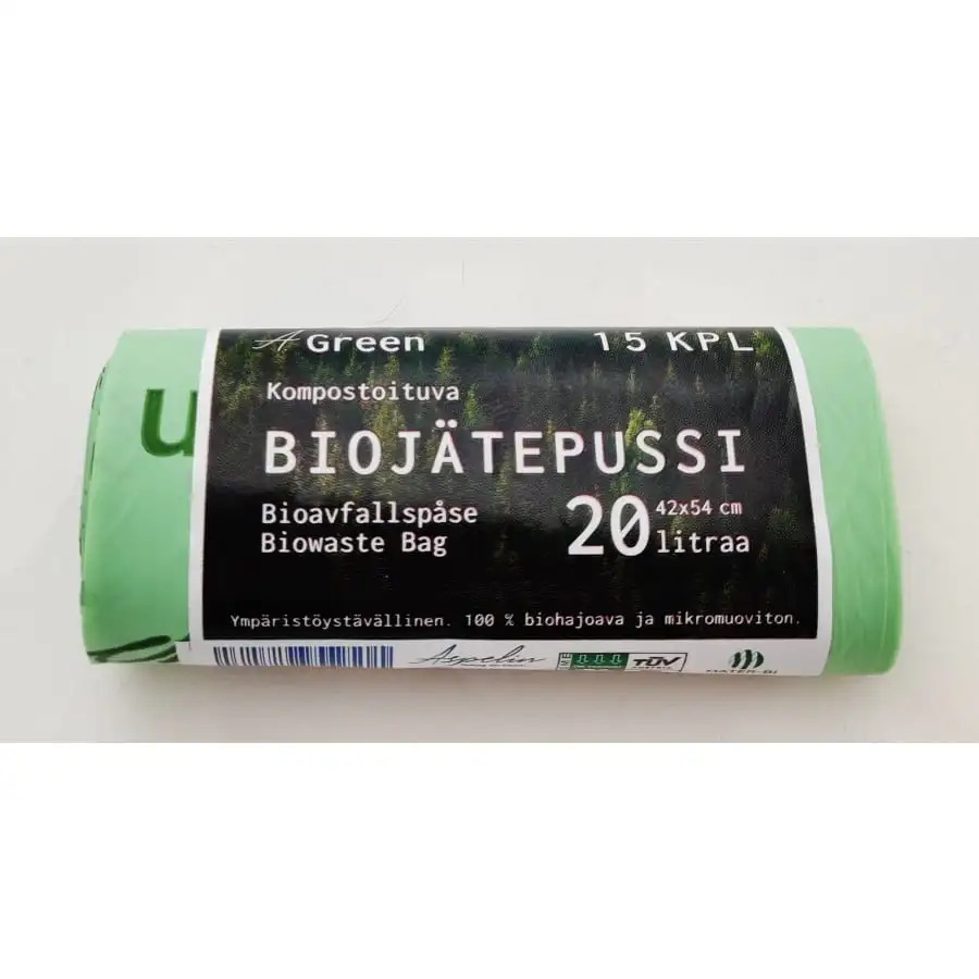 A. Green bio waste bag for home compost 20 liters. Size 42×54 cm, thickness 15 my. Made of certified mater-bi bio film that breaks down in home compost. 15 pcs in a roll.