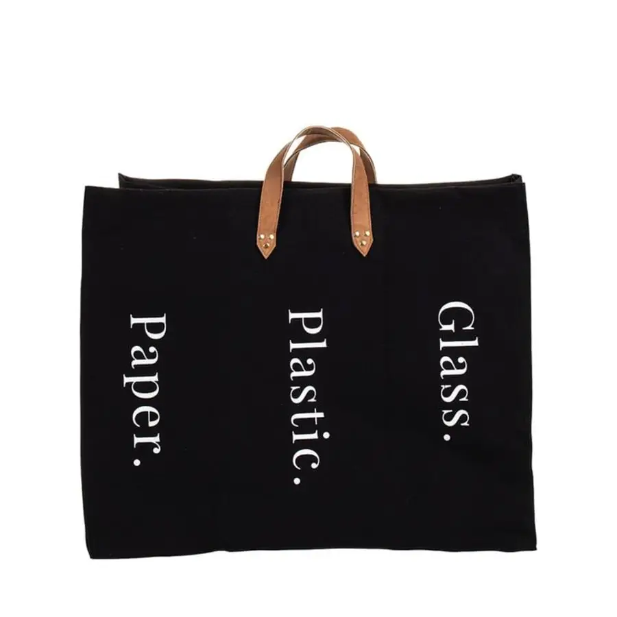 A stylish recycling bag for glass, plastic and paper that stands out. The bag has three compartments with the text ”Glass. Plastic. Paper.” and brown handles. The inside is coated to repel dirt. Cleaning with a damp cloth. Size 40 x 26 x 60cm.
