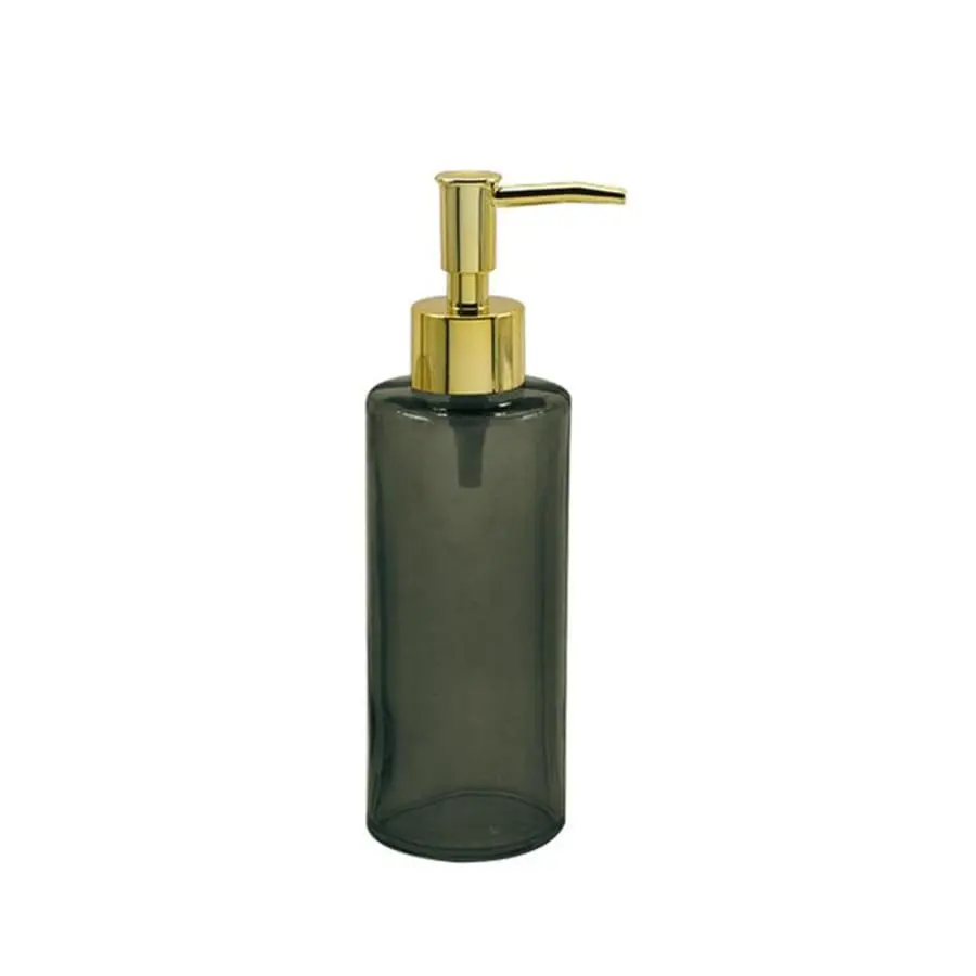 Glass dark gray pump bottle for soap with a gold colored plastic pump. Size 6×19.5 cm.