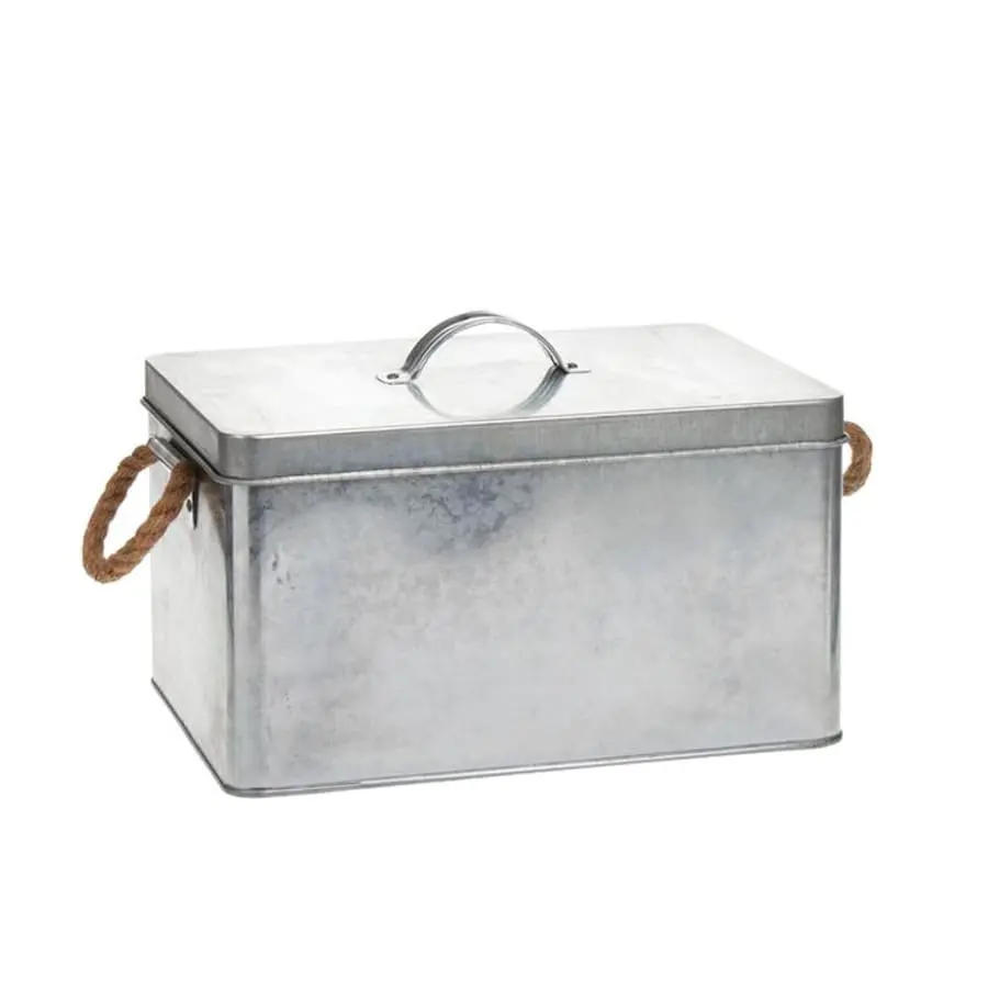 En plåtlåda för mångsidig förvaring eller som presentförpackning för stuggäster. Lådan har plåtlock och jutehandtag. Storlek 28x20x19cm.