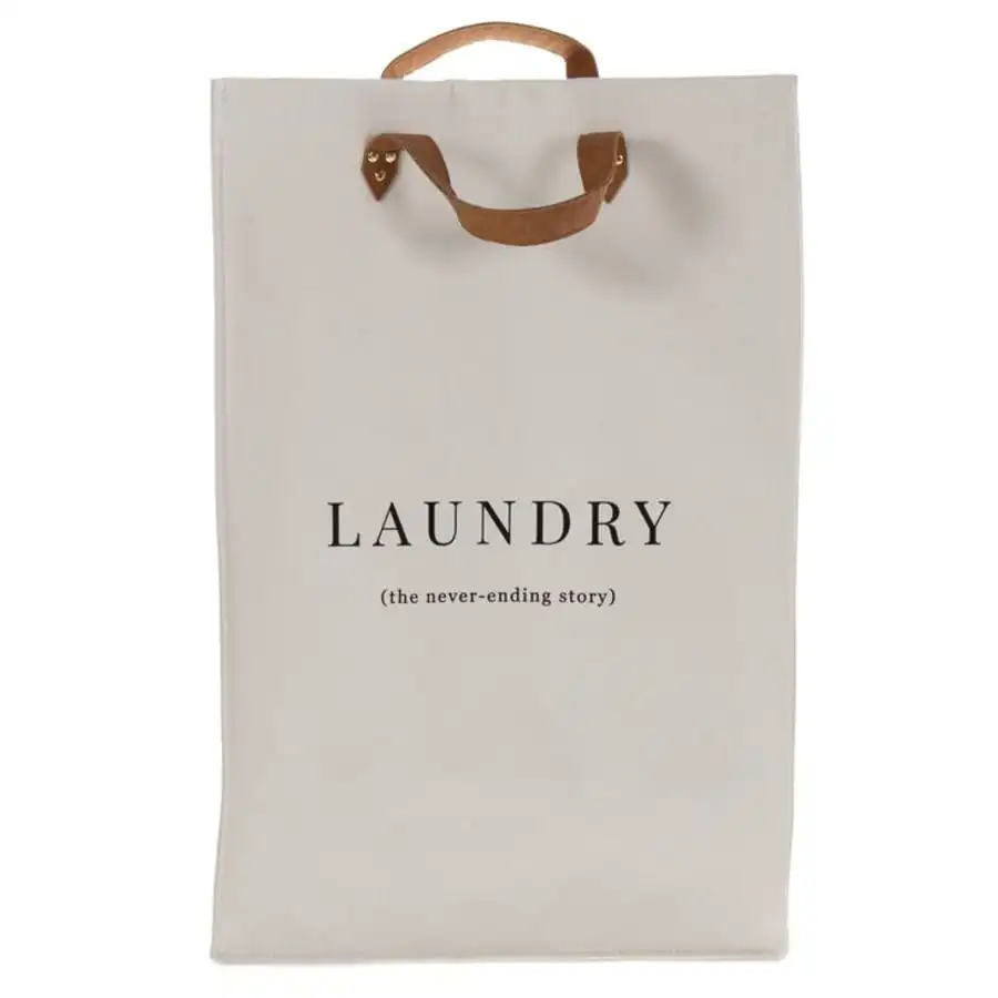 White Laundry basket with black text ’Laundry. The never-ending story’
