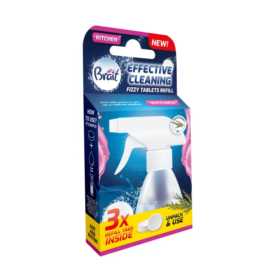 3 x 2 g tabletter. Rengör effektivt särskilt köket. Frisk naturlig rosmarindoft. Tillsätt bara vatten + en tablett så får du 425 ml kraftfullt rengöringsmedel. När hemstädning och miljö är viktigt för dig. Mindre utsläpp inom transporter. Mindre plastavfall. Ingredienser 99% naturligt ursprung.