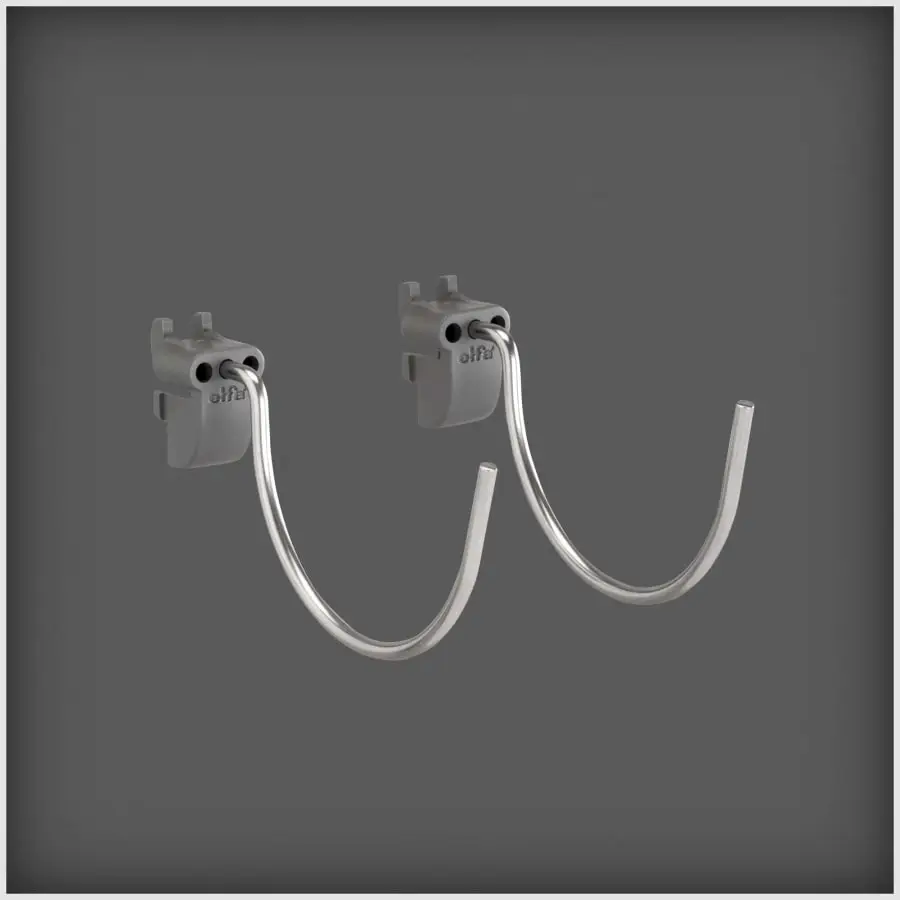 A hook that can be easily attached to Elfa’s storage board. Suitable for e.g. for storing a rubber mallet or sledgehammers. Two hooks in the package. Hook size 95 mm. Color: Grey. Material steel/plastic.