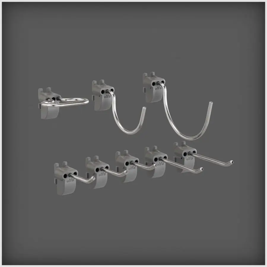 Krokar som enkelt kan fästas på Elfas förvaringsbräda. Paketet innehåller 8 krokar, fem olika modeller. Färg: Grå. Material stål/plast.