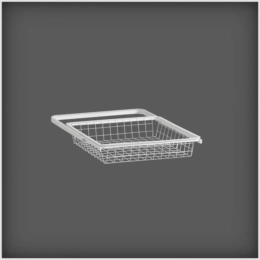 Elfa utdragbar korgram och trådkorg fästs på skenan med fästen. Idealisk för bulk-/kläderförvaring. Bredd 449 mm, djup 430 mm, höjd 85 mm. Material stål.