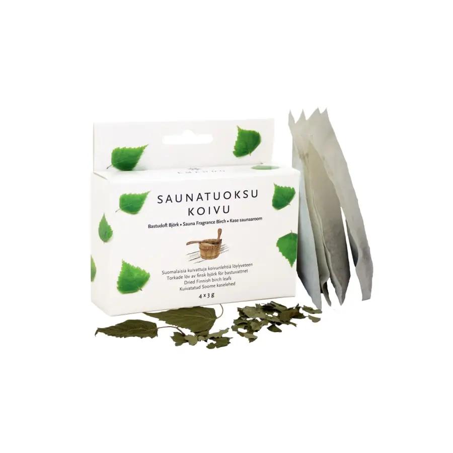 Sauna fragrance Birch is made of pure Finnish dried birch leaves. The package includes 4 bags of birch leaves. Soak the bag in the warm water intended for throwing on the sauna coals. Pour the water on the hot coals according to preference and enjoy the genuine aroma of birch in your sauna. If you allow the bag to dry after use, its scent will suffice for re-use in several saunas.