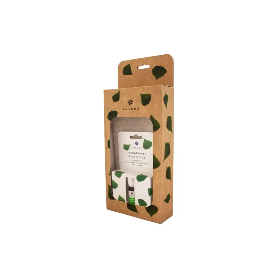 Emendo’s sauna gift set contains 2 x Natural peflette and Eucalyptus 10 ml sauna fragrance.