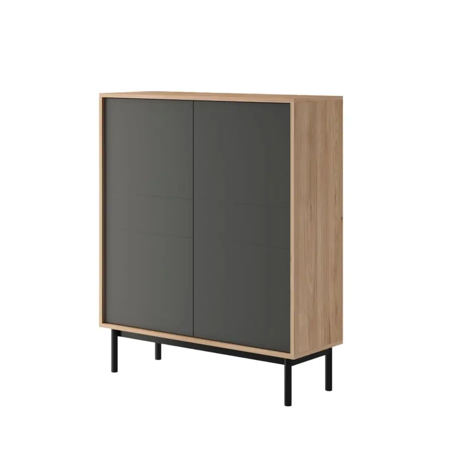 Stilrent och modernt Milo-skåp med gott om förvaringsutrymme. Skåpet har en ekfärgad 18 mm laminerad möbelskivstomme, grå frontset, ABS kantlist och svartmålade träben. Skåpet har två luckor och två breda mellanhyllor inuti skåpet. Dörrarna har en push-to-open-mekanism. Skåpets bredd är 104 cm, djup 39 cm och höjd 126 cm. Leverans i delar.