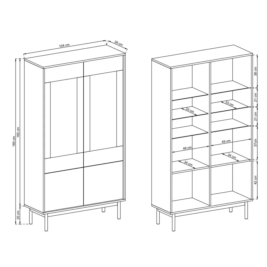 A stylish and modern Milo showcase with plenty of storage space. The display case has an oak-colored 18 mm laminated furniture board frame, gray front sets, ABS edge strip and black painted wooden legs. The showcase has two tempered glass doors with a push-to-open mechanism. In the upper part of the showcase there are three glass shelves on both sides of the partition, and in the lower part there are shelves on both sides of the partition. The display case is 104 cm wide, 39 cm deep and 185 cm high. Delivery in parts.