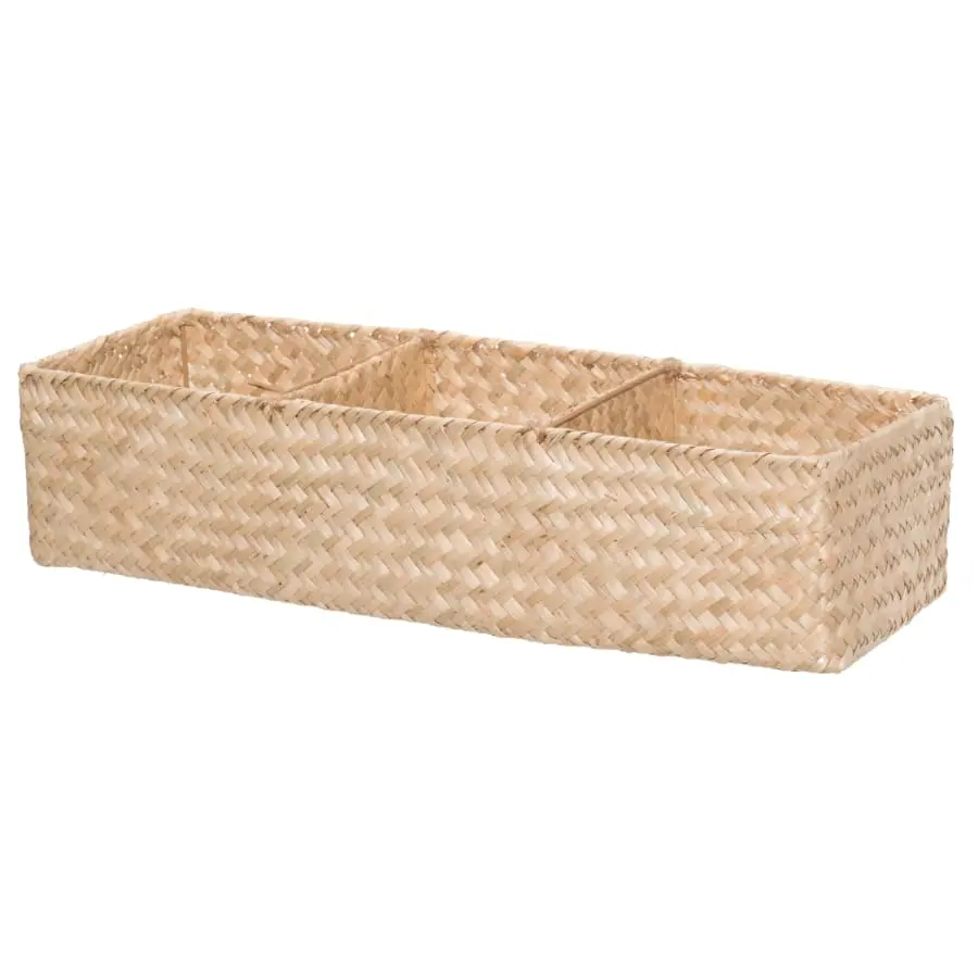 The stylish three-compartment seagrass basket is convenient for storing small items in the home and maintaining order. Excellent for small face towels, cosmetic bottles and many other items. The basket is sturdy and its structure is reinforced with a metal frame. Seagrass is a natural material and colour may vary.