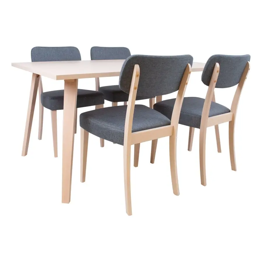 Dining group ADORA table and 4 chairs. Dining table ADORA 150x90xH73cm. The table top is made of honeycomb board and covered with natural beech veneer. Table top thickness 25 mm. The legs and frame are made of whole beech wood. The table is finished with wood-tone white lacquer. Chair ADORA 49x58x85.5cm, seat height 50 cm. The chair is made of solid beech. The seat and backrest are upholstered and covered with gray polyester fabric. The wooden parts are finished with wood-colored white lacquer. Weight limit 100 kg.