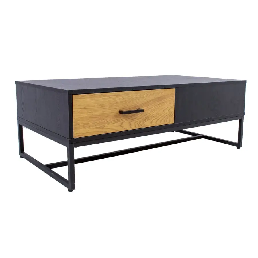 Stylish coffee table Amsterdam with drawer. Black metal frame and other parts melamine board. The box slides and closes softly. Black aluminum handle.
