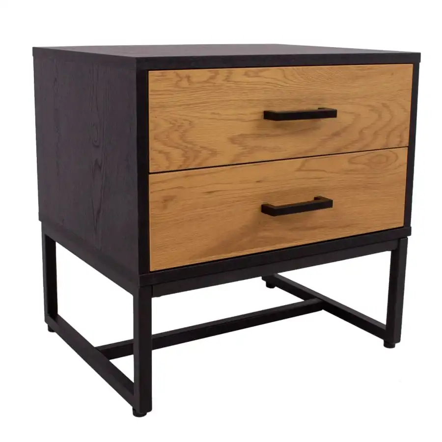 Bedside table Amsterdam with two drawers. Black metal frame and other parts melamine board. Soft-closing drawers with slides. Black aluminum handles.