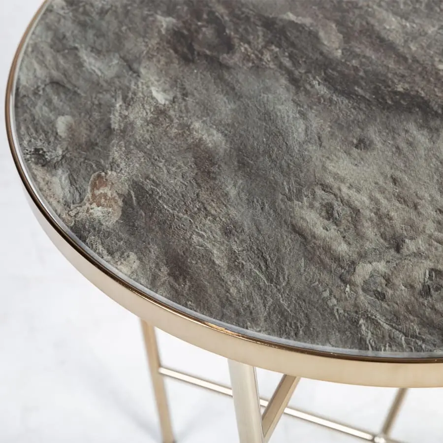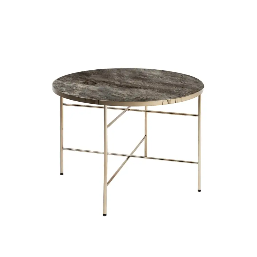 Ett underbart Astroria soffbord med en marmorfärgad glasskiva. Ben och ram i champagnefärgad stål.