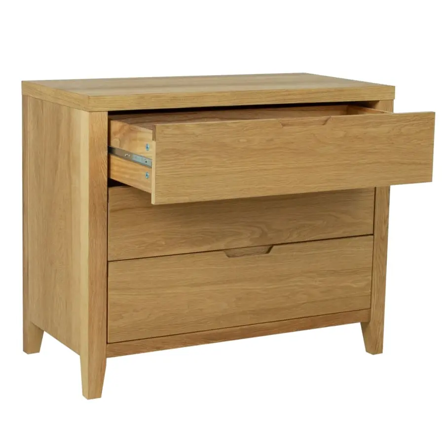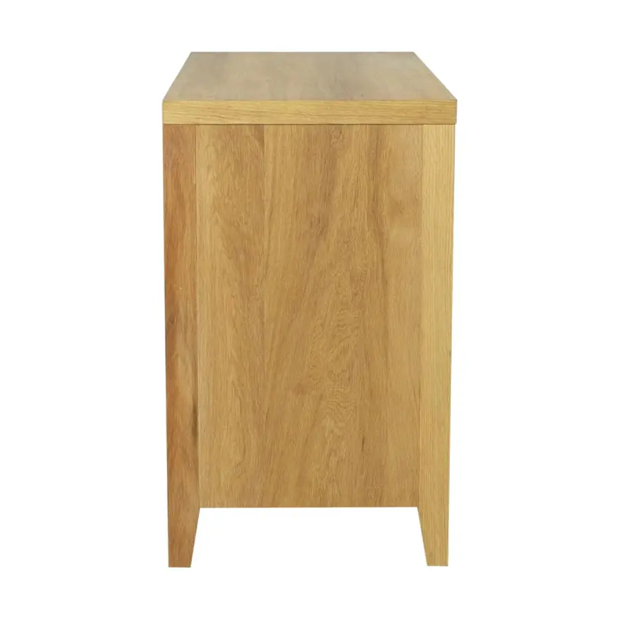 Chest of drawers Chamba with natural oak veneer. The frame and front panels of the drawers are natural oak veneer. Intermediate shelves plywood coated with natural oak veneer. Metal rails in boxes.