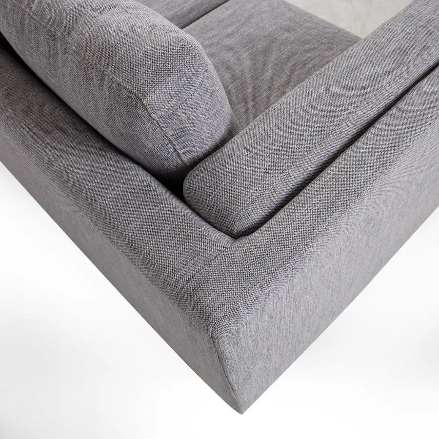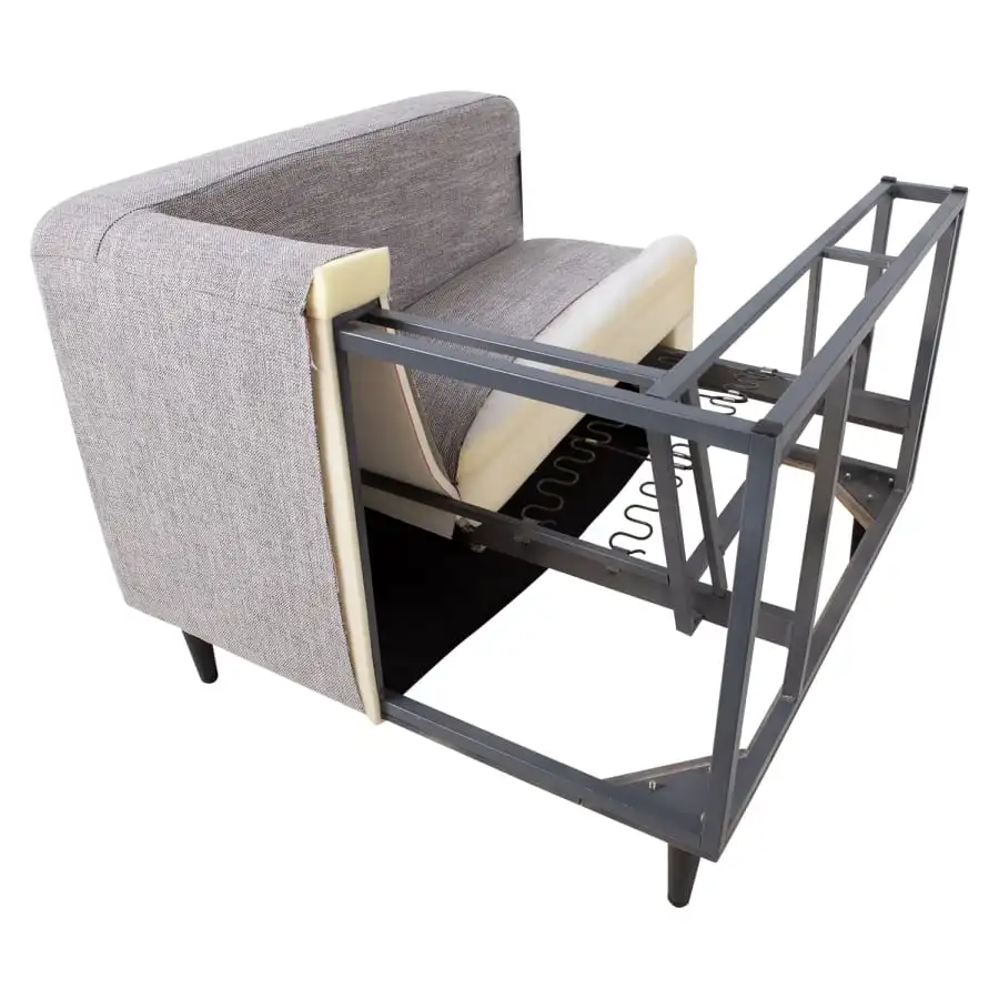 Vacker grå soffa Lissabon. Klädsel 88% polyester, 12% viskos, 20 000 Martindale. Ram: ram i galvaniserat stål. Alla sidor av ramen är täckta med ett lager av skum. Fjädring: högkvalitativa 9G sicksackfjädrar. Klädsel: Det första lagret under sitsens skyddsmaterial är tjock och mjuk polyesterfiber, det andra lagret under är mjukt polyuretanskum som tillsammans ger sittkomfort och en vacker form. Det tredje lagret av upphängningen är ett mycket tätt, högkvalitativt polyuretanskum som stöder sätet ordentligt. Ryggdynan är fylld med kanaliserad tjock polyesterfiber. Stålben med träimitation. Jämfört med traditionellt tillverkade trästomme stoppade möbler är metallram stoppade möbler betydligt mer hållbara och lättare.