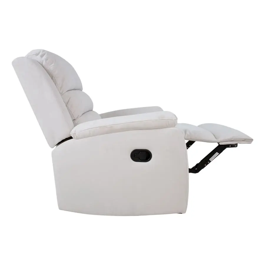 Underbart plysch Manuel mekanismstol. Positionen på ryggstödet och fotstödet kan ändras med en manuell mekanism. När fotstödet höjs förflyttas ryggstödet mjukt till viloläge. Ram av trä och metall. Vaddering polyuretanskum 24kg/m³ och klädsel 100% polyester.