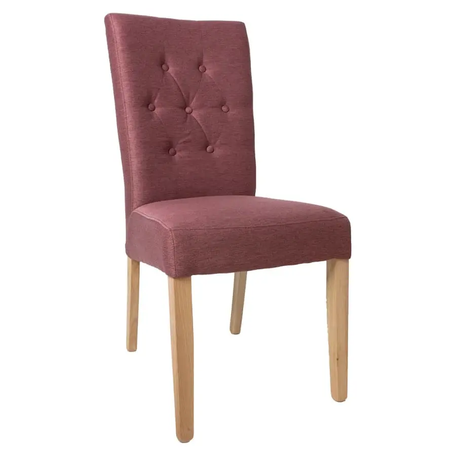 Dining chair Queen, with luxurious back design. Available in several different colors. The legs of the chair are made of oak and the seat is upholstered with polyester fabric. Seat and backrest padded.