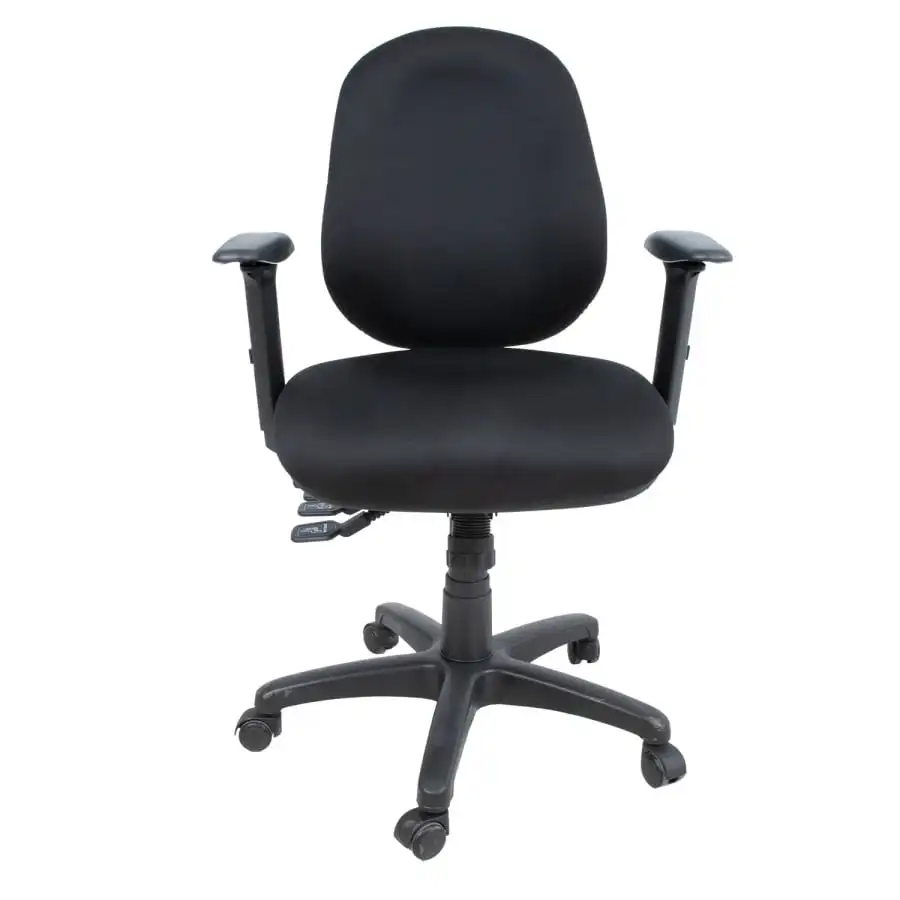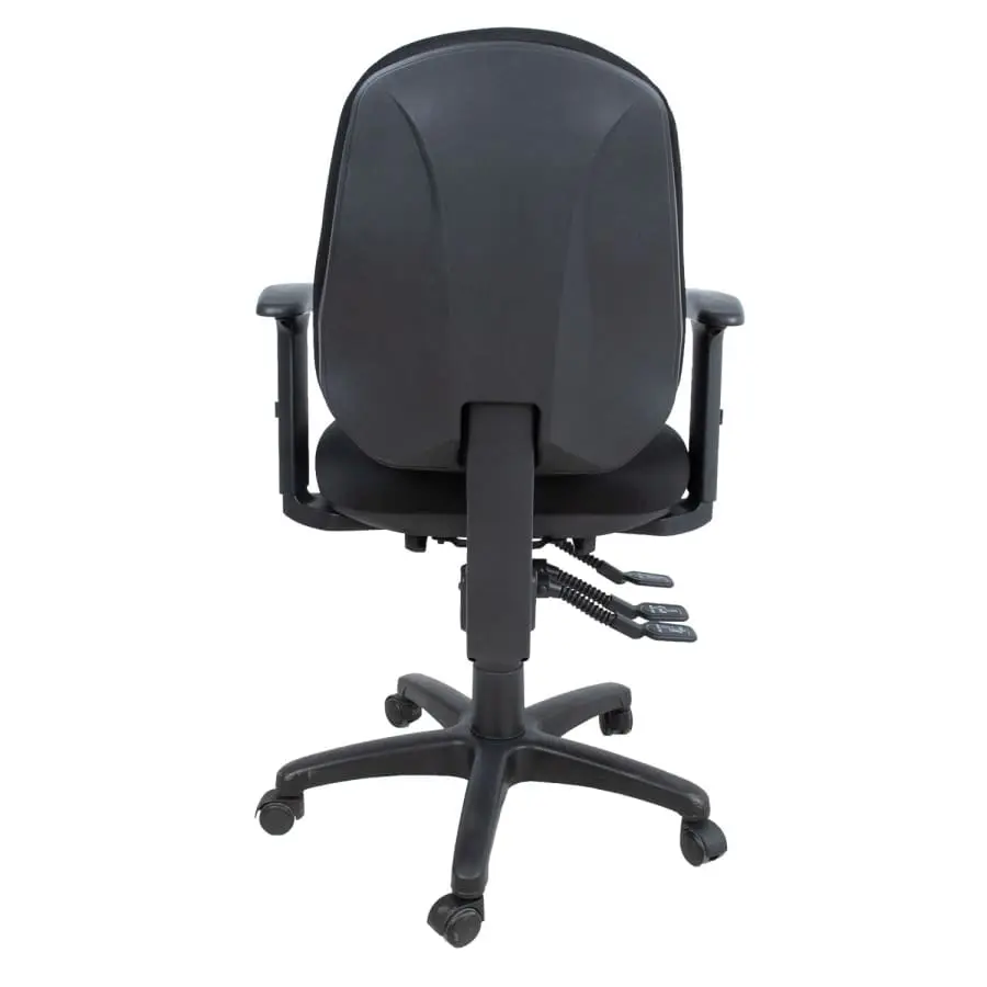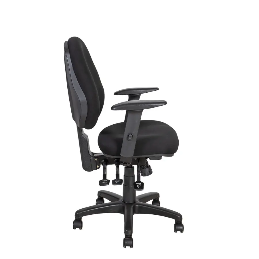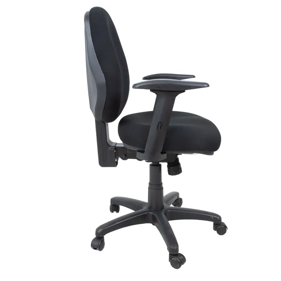 Tuotooli Saga, ergonomic model, versatile adjustable, soft padding and comfortably shaped seat. Upholstery material: polyester, 50,000 Martindale. Black plastic case. Mechanism and adjustments: synchronous mechanism, lockable in several positions. It is possible to adjust the seat and backrest independently of each other. Backrest height adjustable 49-56.5cm, backrest tilt angle adjustable. Seat depth and inclination adjustable (negative inclination), seat height adjustable with gas spring. The steel armrests are covered with black plastic. The armrests are adjustable in 3 directions: height adjustable 19.5-29cm, the support surface of the armrests can be pushed forwards and backwards and the turning angle can be changed in-out. Polypropylene plastic black 5-prong leg cross D64cm, 50mm plastic wheels.