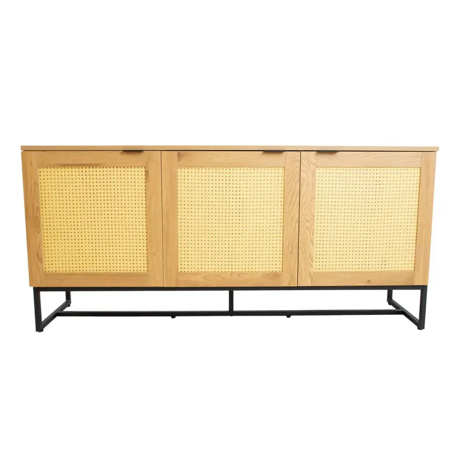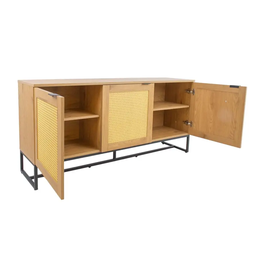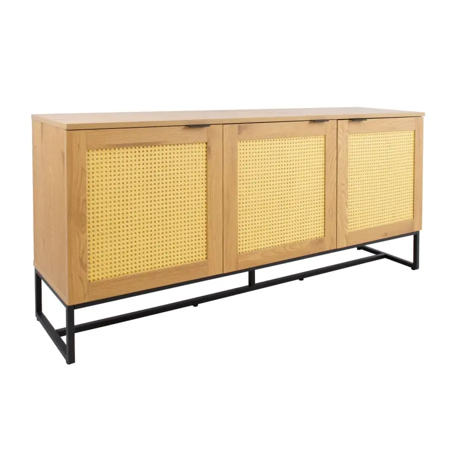 Side table SAILOR 160x40xH75cm, melamine, oak decoration. The product is made of melamine-coated furniture board, which is stylishly complemented by rattan-like plastic panels. The base frame is made of metal and finished with black powder paint. The height of the metal frame is 18.5 cm. The side table has three quietly closing doors, one intermediate shelf behind each door. The doors have black metal handles.