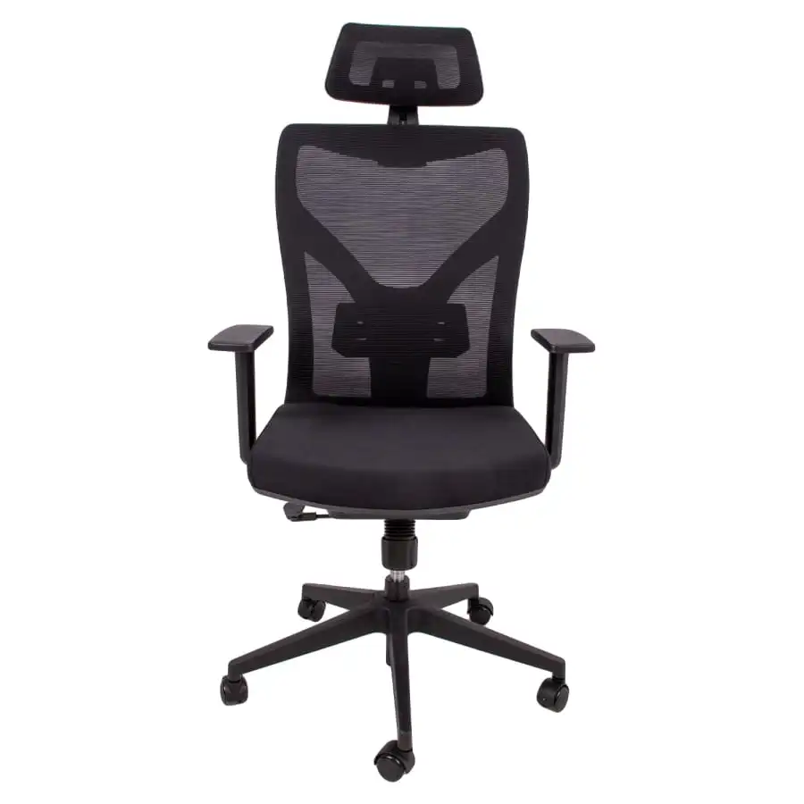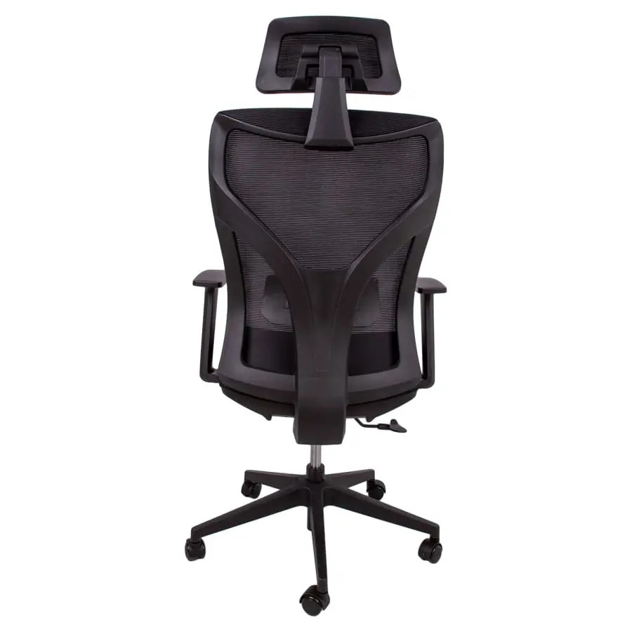 Istuin on päällystetty polyesterikankaalla, 50 000 Martindalea. Selkä- ja niskatuki on päällystetty polyesteriverkkokankaalla, 30 000 Martindalea. Tuolissa on kallistusmekanismi, lukittava yhteen asentoon. Säädettävä ristiseläntuki. Pneumaattinen istuimen korkeuden säätö. Runko ja selkänojan runko on valmistettu mustasta muovista. Käsinojat ovat kiinteät. Pääntuen korkeus ja kulma on säädettävissä. Musta 5-piikkinen muovijalusta, R34cm. Nylon pyörät, 50mm. Korkeus 94-100,5cm, istuimen leveys 49cm, syvyys 48cm, istuinkorkeus 45-54cm.