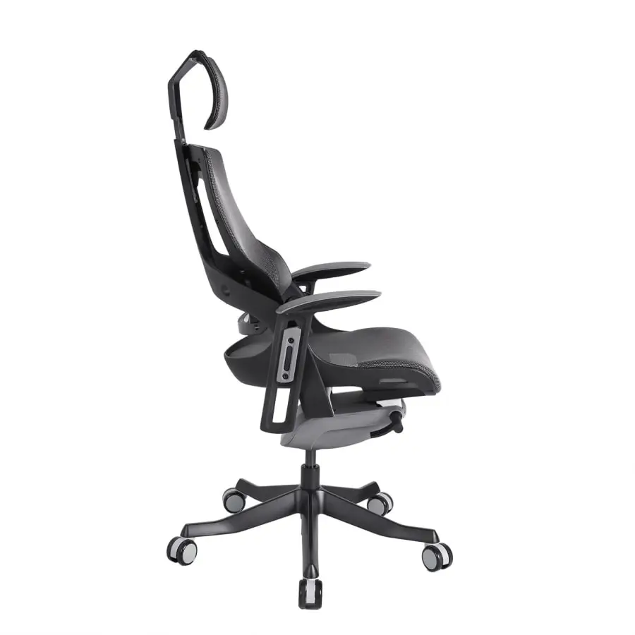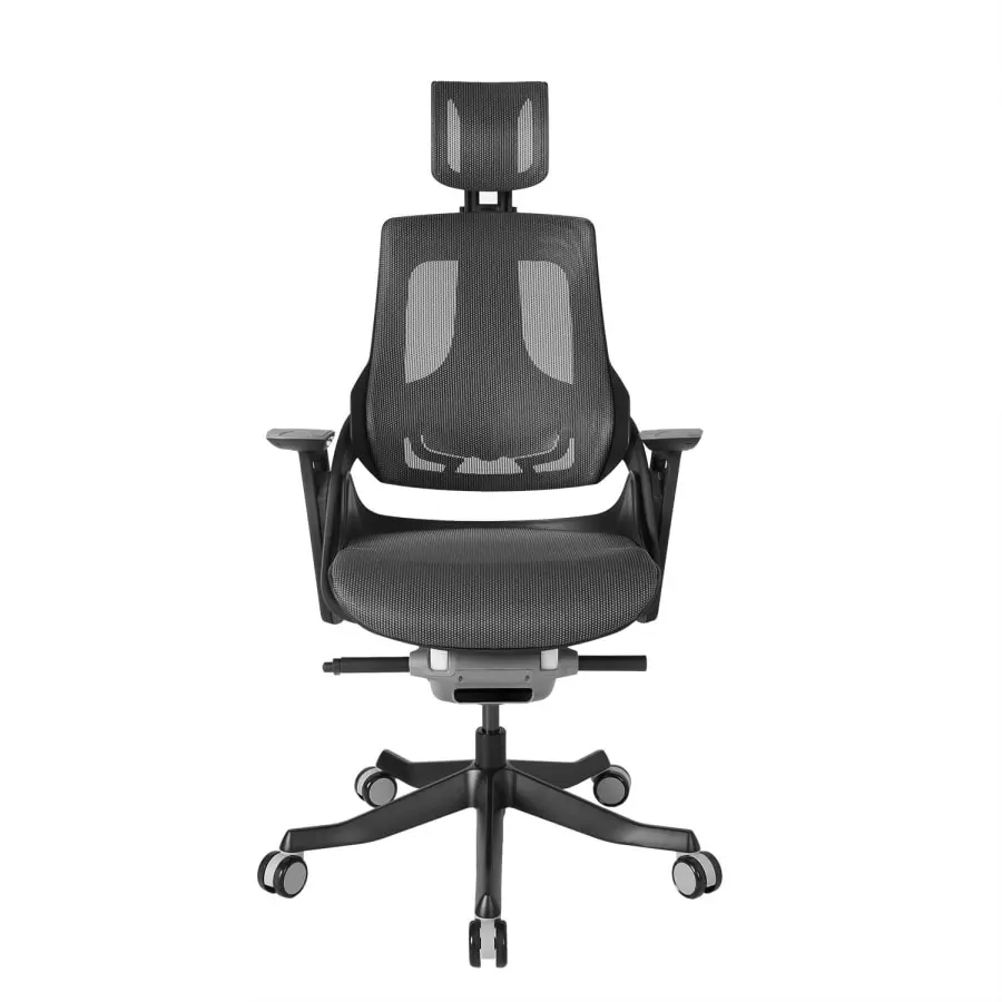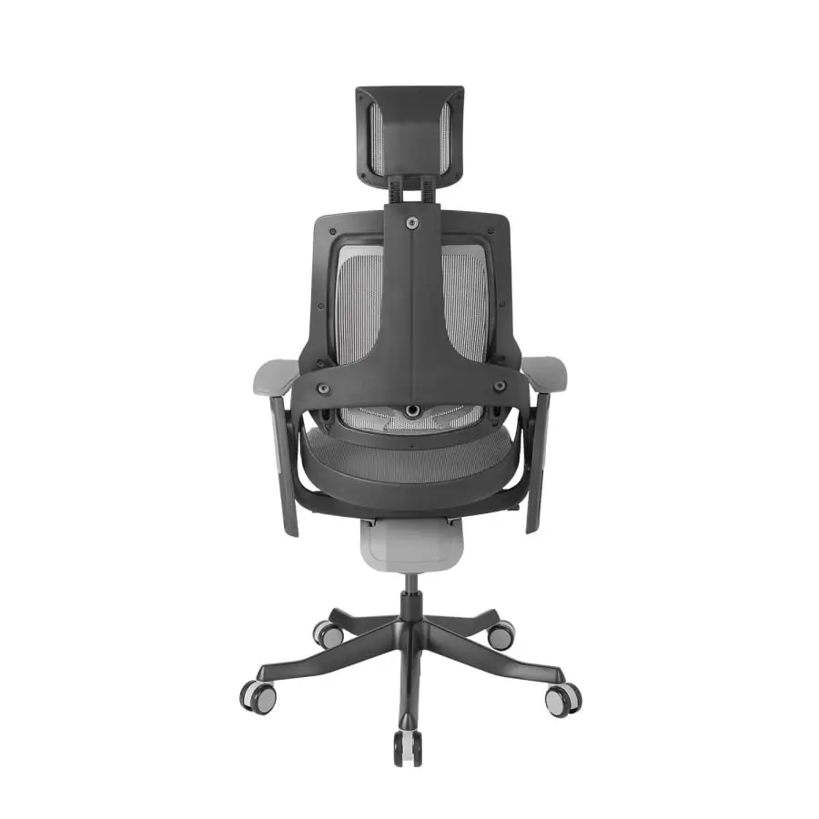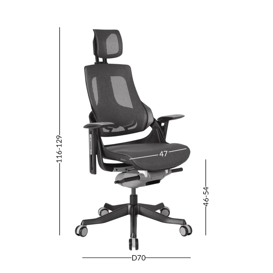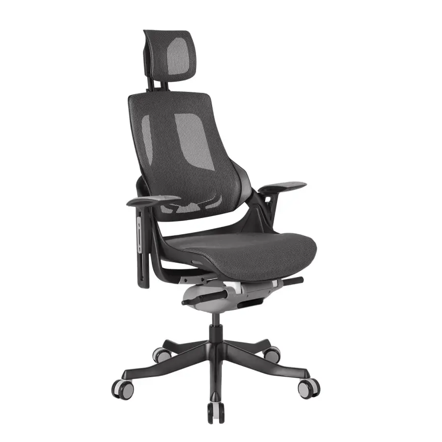Kontorsstol Wau med stilren design och ett bra urval av justeringsfunktioner. Synkronmekanism, låsbar i flera lägen. Gungans styvhet kan justeras baserat på vikten på sitter. Ryggstödets kurvatur är justerbar. Sitshöjd justerbar med gasfjäder. Armstöden är gjorda av polyuretan och deras höjd och lutningsvinkel är justerbara. Höjden på nackstödet är justerbart. Sits av polyestertyg och rygg av andningsbart polyestermeshtyg, 100 000 Martindale. Fotgallret är tillverkat av aluminium och hjulen är golvbesparande gummihjul.