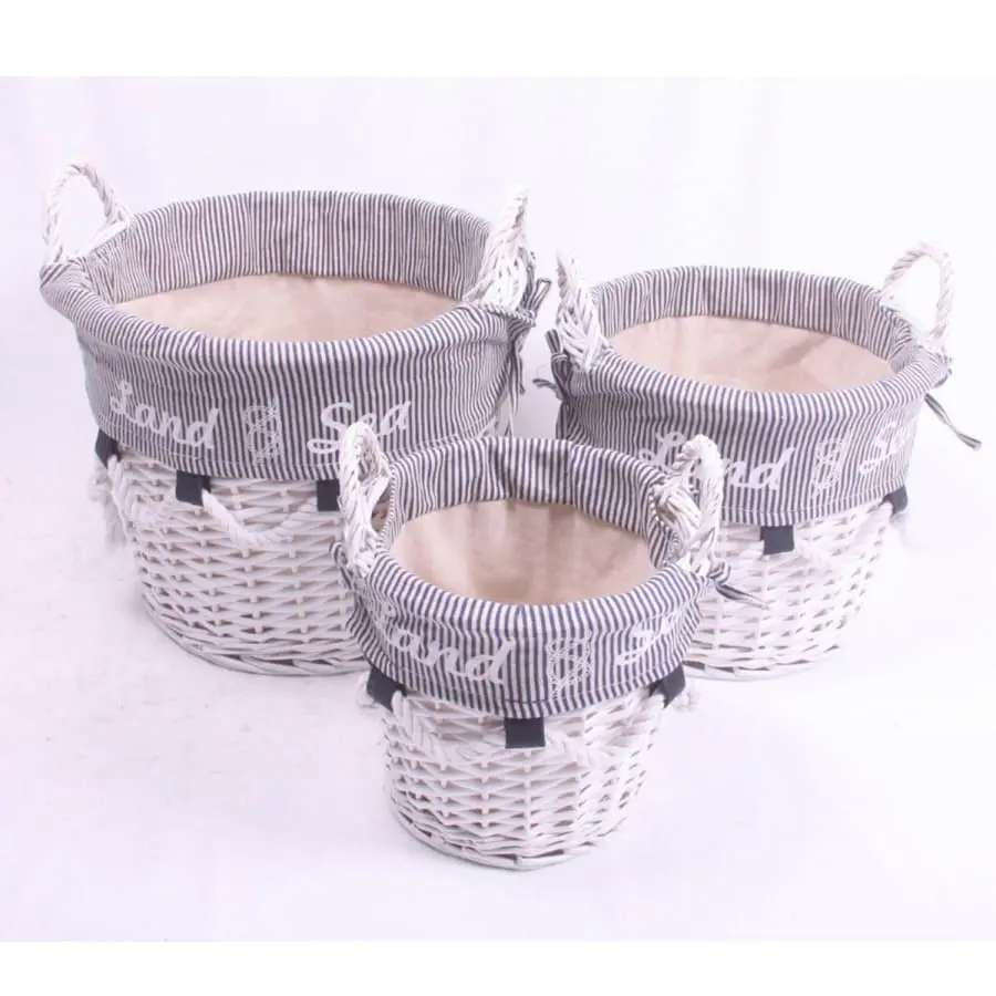 Round basket WILLI SEA, L: D38xH30cm, white. Basket material: hand-woven natural willow, color: white, textile lining: blue-striped cotton with rope. Text: Land&Sea.