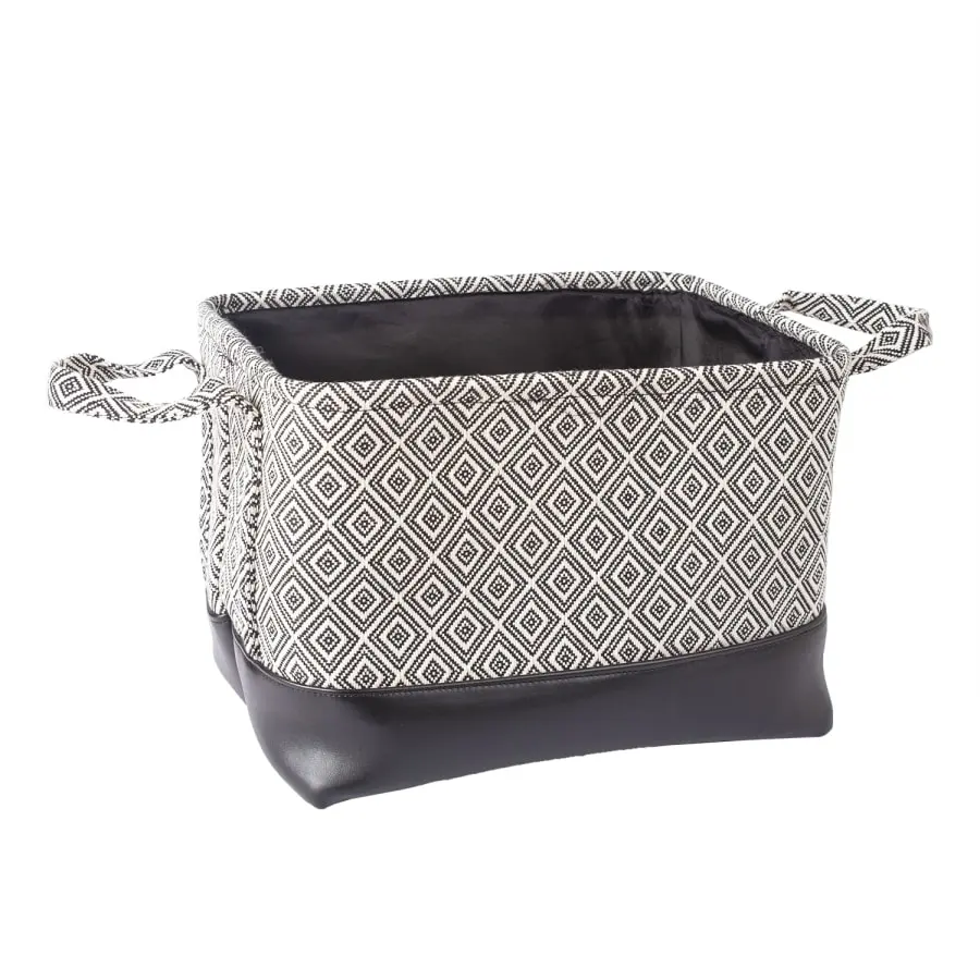 Basket YANA-2, 37x27xH28cm, black and white pattern. Material: polyester and polyurethane storage basket. Black handles.