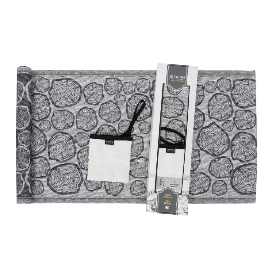 The set includes a Mänty white/black tablecloth, which is 45×160 cm in size and a white Laituri soap dish (size 13×13 cm).