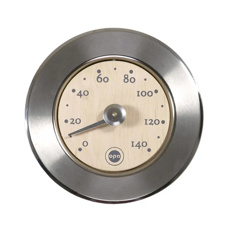 A very stylish thermometer for the sauna. Brushed stainless steel rim, wooden meter part. This meter is a small element with which you create style in the sauna. Diameter 17 cm, meter part 10.5 cm.