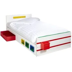 The Room2Build bed is full of convenient features, such as a fabric storage box under the bed, an integrated storage box for building blocks, 3 colorful holes and building rails at the end of the bed. The classically designed white bed is enlivened by bold colorful details. This is a real dream bed for every budding architect.