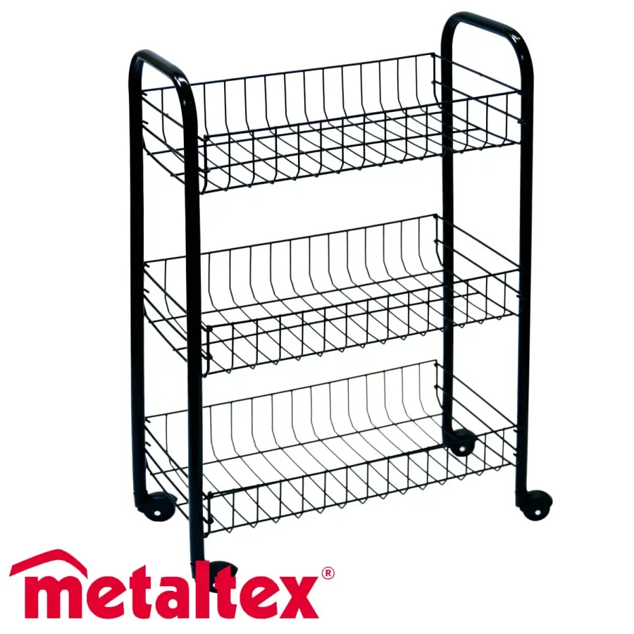 Metal trolley with wheels and 3 storage levels. Color black. Assembled dimensions: 41x23x63 cm.