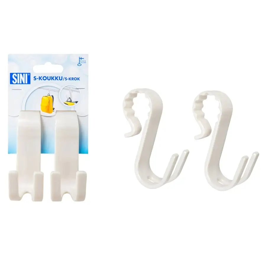 S-kroken är en bekväm hängkrok för många typer av hängning. Kroken har en flexibel struktur, så den sitter stadigt på stången. Två parallella krokar fördubblar upphängningsutrymmet. S-kroken är en nyckelbricka som designats och tillverkas i Finland.