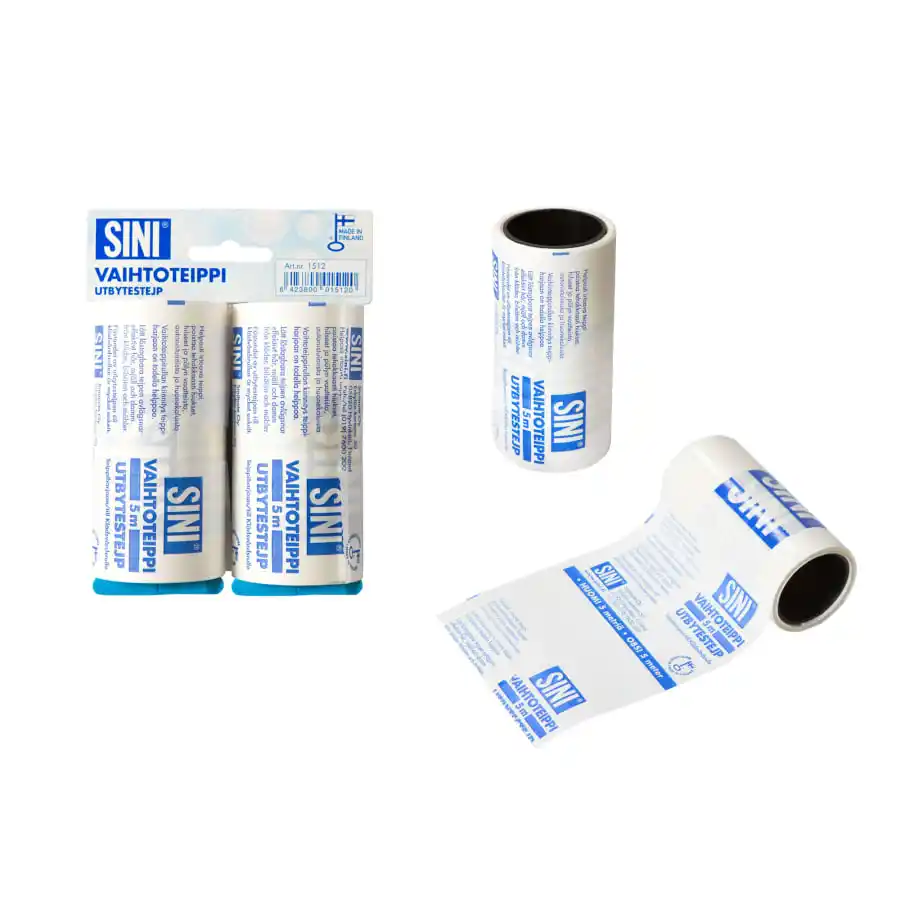 - Sini-vaihtoteippirulla on helppo vaihtaa teippiharjan kahvaan