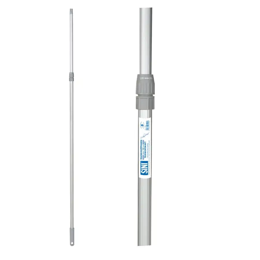 teleskoparmen av aluminium kan förlängas till en längd på upp till 180 cm. Tack vare sin längd är den ett behändigt verktyg för t.ex. när du tvättar fönster eller borstar spindelväv från hörn. Att justera längden på skaftet fungerar genom att vrida.