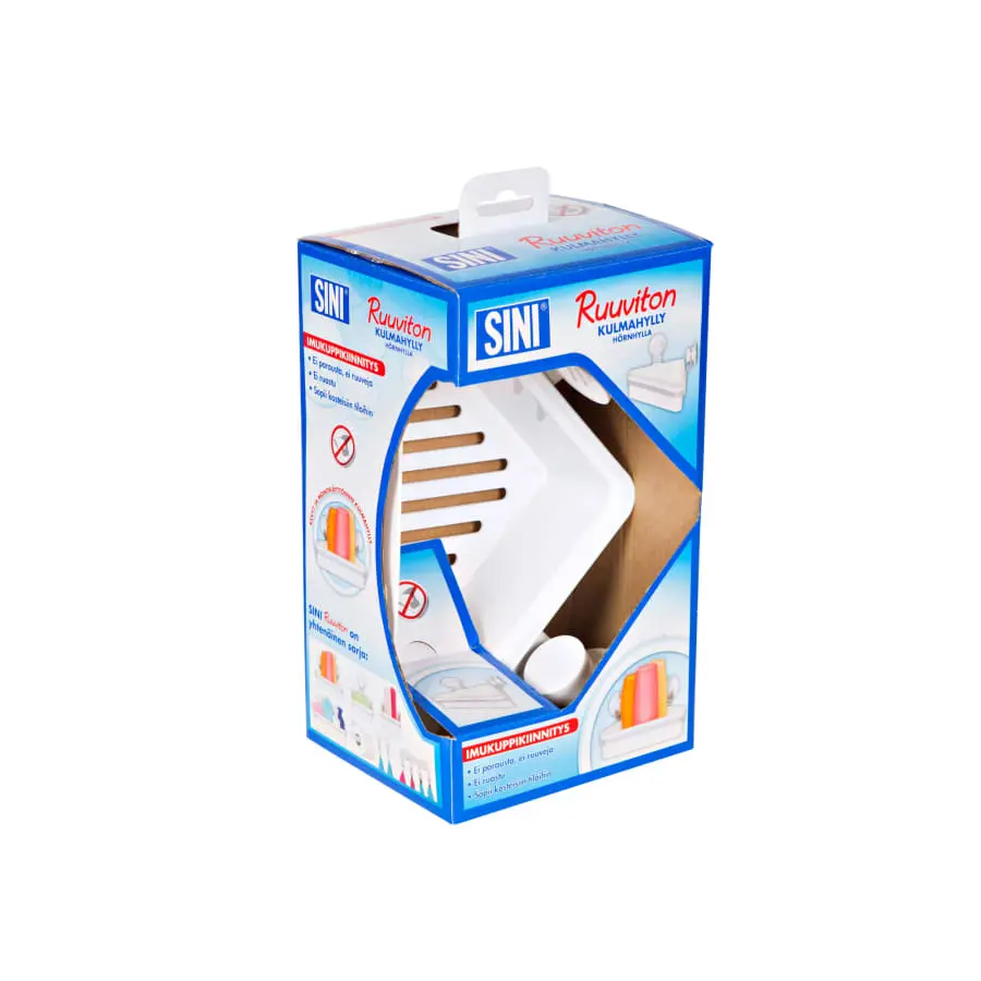 Den lätta och mångsidiga SINI skruvlösa hörnhyllan är lämplig för badrum, kök och grovkök. Stativet fästs med sugkoppar på en slät kakel eller glasyta utan borrning eller skruvar. Fästet är baserat på en unik patenterad sugkopp omgiven av en lufttät och vattentät silikonring. Hörnhyllan är en lösning för hörnmodellen, så tvättmedel kan alltid hittas på rätt plats. Bygg den mest passande helheten från de olika produkterna i Ruuvito-serien genom att kombinera olika delar som du vill!