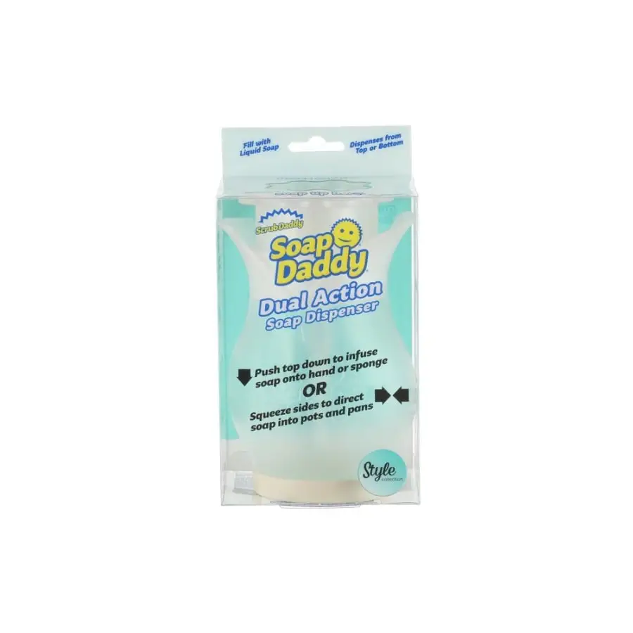 Twist to open and fill with your favourite soap. Dual-action Soap Dispenser. Dispenses soap 2 ways for your convenience! Press down the top to apply soap directly onto your sponge, scour pad or hand. Squeeze the sides to dispense soap into pots and pans. Soap Daddy can be used in the kitchen for dishwashing or the bathroom and shower to dispense shampoos and conditioners.