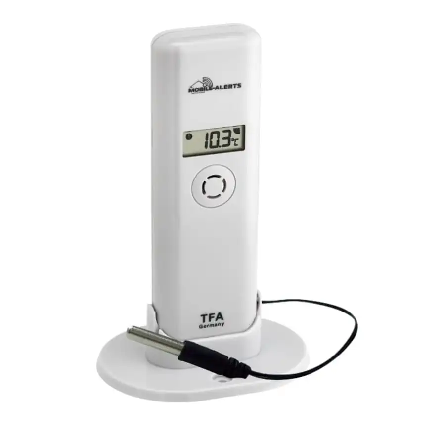 WeatherHub transmitter with wire sensor that measures temperature up to +110°C. Take the thread to the steam room and leave the transmitter on the side of the washroom. The transmitter can also be installed in the sauna room if you leave it as close to the floor as possible and take the sensor up to the wall. Set the alarm temperature in the application and your phone will notify you when the sauna is ready.