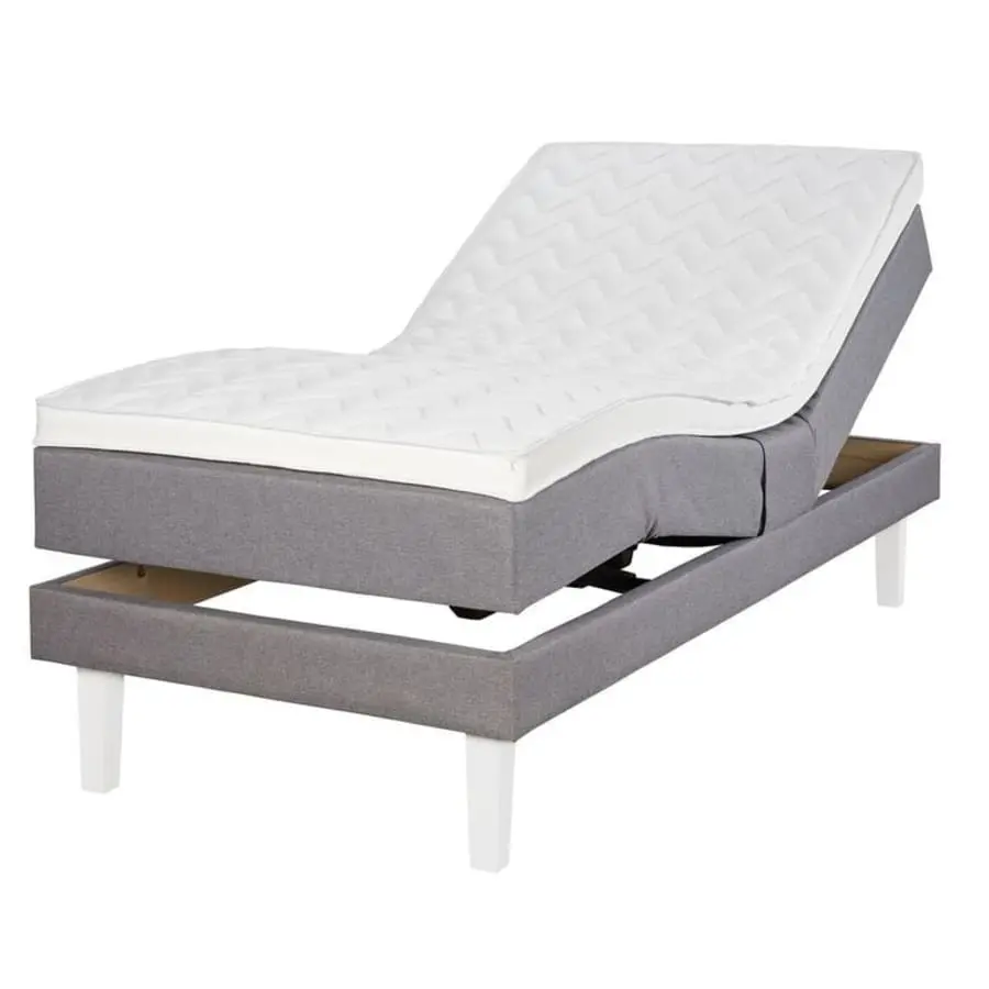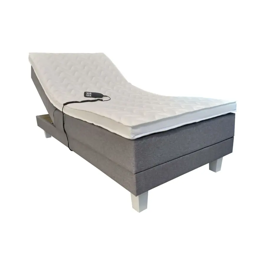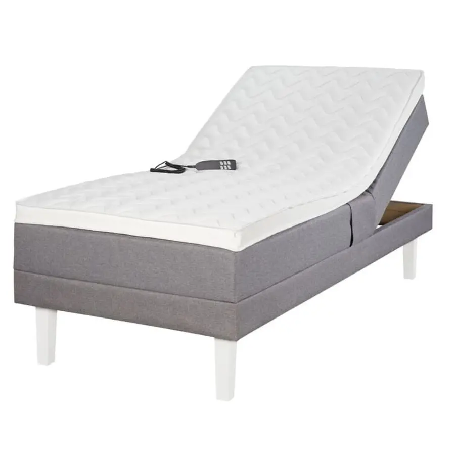 Kraftig ram i massivt trä, vitmålade träben. (benhöjd 23cm) Stomme klädd Malmö nr 90 grå. Ovandel i vitt stretchtyg. Förspända påsfjädrar 270/m2, fjädertjocklek 2mm. Den fjädrande delen är stadigt integrerad i motorbasen Madrassen är klädd med vitt stretch elastiskt tyg, kärnan är 5 cm tjock 25 kg skum och ytmjukheten är 1 cm möbelvadd, madrassens totala höjd är 7 cm. Justeringsbasen fungerar med hjälp av två motorer. 3-funktions steglös fjärrkontroll, trådbunden kontroll.