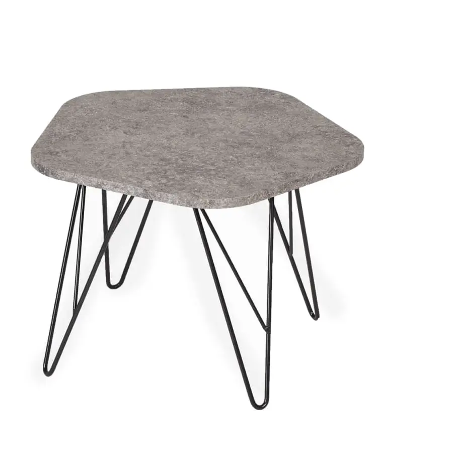 Modern coffee table with metal, black painted legs and a spectacular stone imitation top.