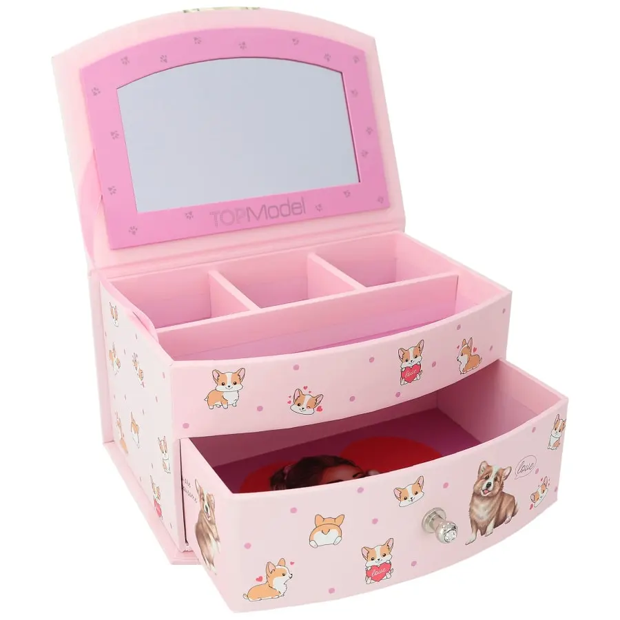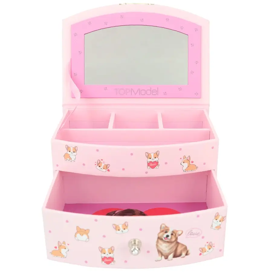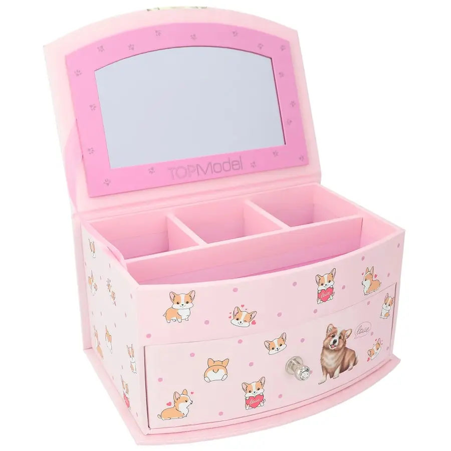 Sött smyckeskrin i en fin TOPModel Corgi-design. Med spegel, separata fack och lådor för att förvara alla dina små skatter.